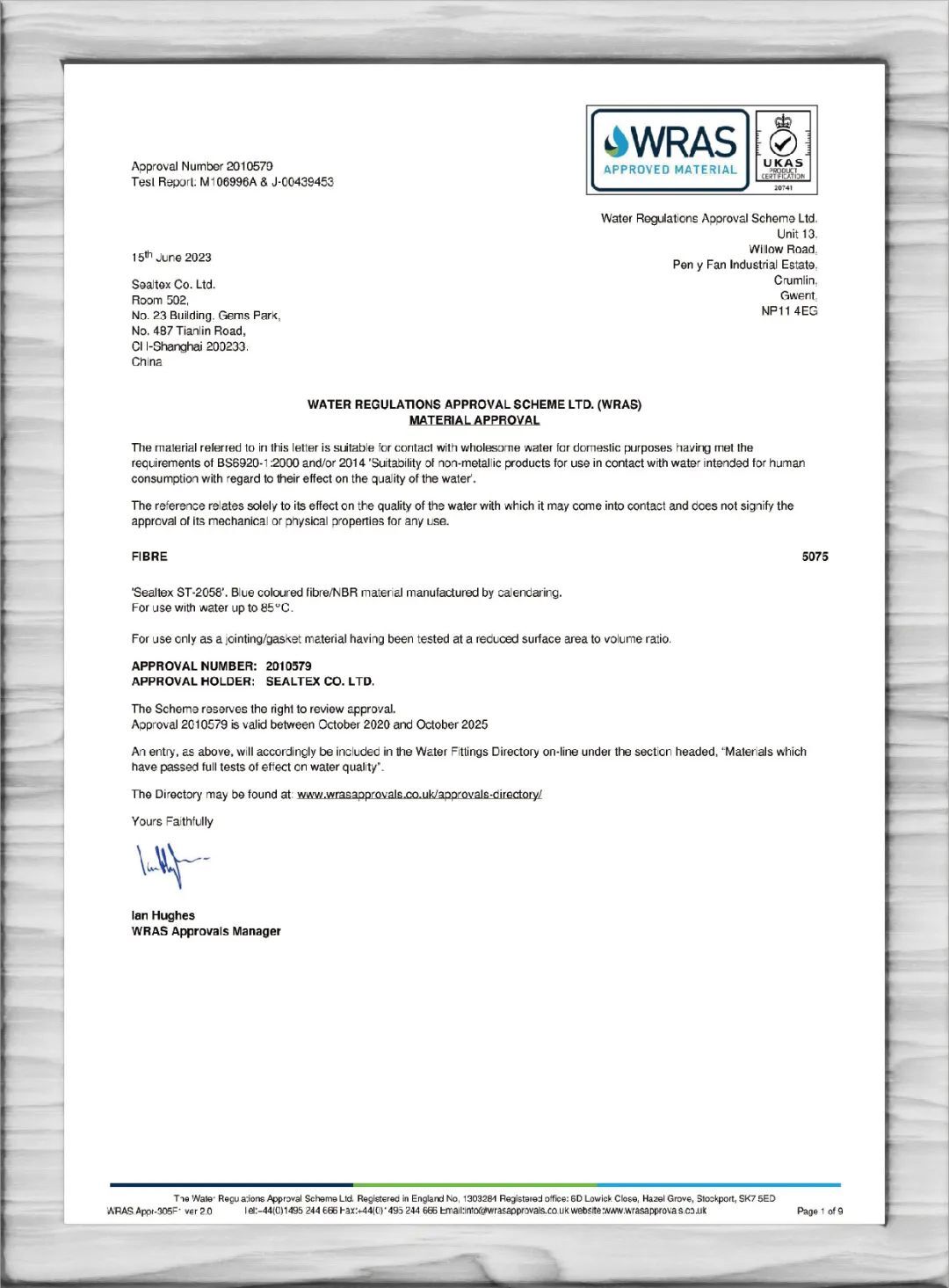 SealTex索拓ST-2058無(wú)石棉密封材料通過(guò)WRAS(Water Research Advisory Scheme)認(rèn)證。